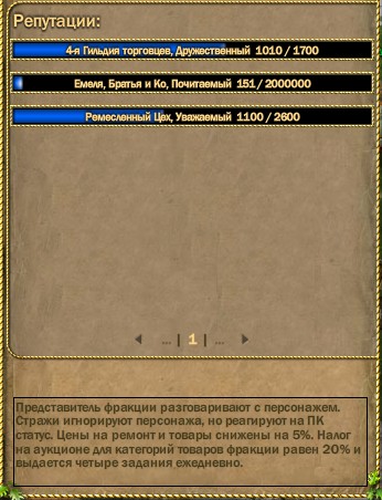Всего в Игре существует 4ре торговых гильдии. Каждая из них при повышении репутации в той или иной гильдии дает возможность торговать через аукцион с меньшим процентом налогов. Изначально все торговые гильдии кроме 4ой закрыты, а при торговле через аукцион с вас снимается 90%налог, это значит что вам на почту при успешной продаже придет только 10% от цены за которую вы продали вещь.