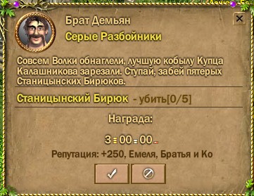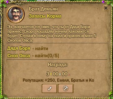 Целью повышения репутации является возможность получения квестов на Улучшенную гнедую лошадь. Конюшня находится в верхнем правом углу города Фрагорск. Подходите к брату Емеле он выдает задание найти Брата Ивана. Брат Иван стоит чуть левее. Брат Иван отправляет найти Брата Демьяна. Брат Демьян стоит чуть выше. На ряду с основным квестом на постоянную лошадь "К ведьме за припарками" он ежедневно выдает 2 квеста на повышение репутации "Запасы корма" и "Серые Разбойники".